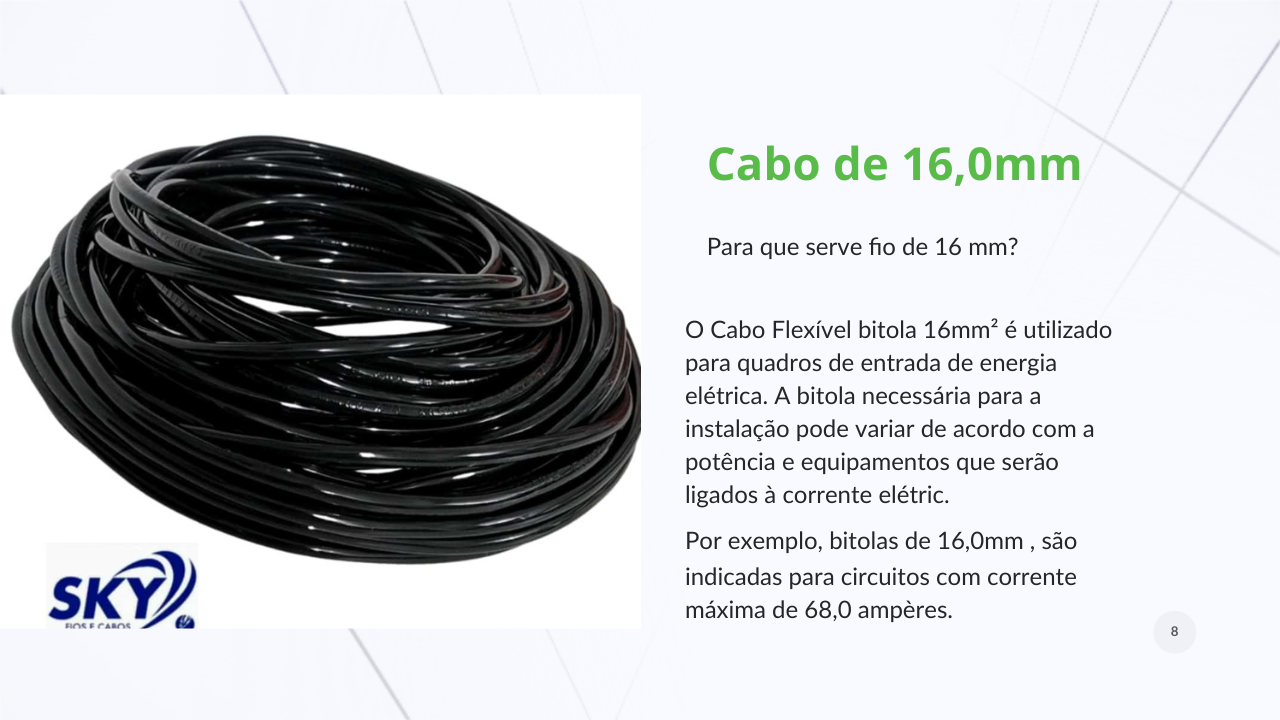 O Cabo Flexível bitola 16mm² é utilizado para quadros de entrada de energia elétrica. A bitola necessária para a instalação pode variar de acordo com a potência e equipamentos que serão ligados à corrente elétrica.